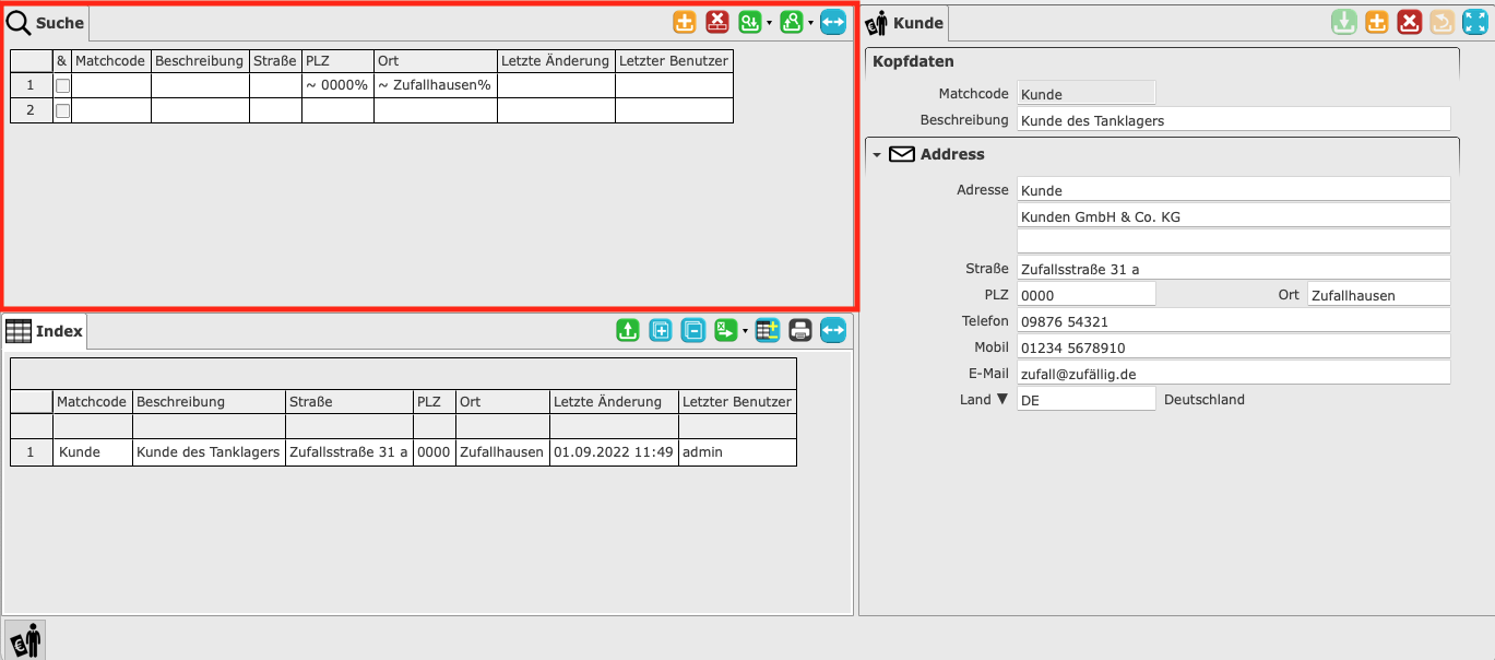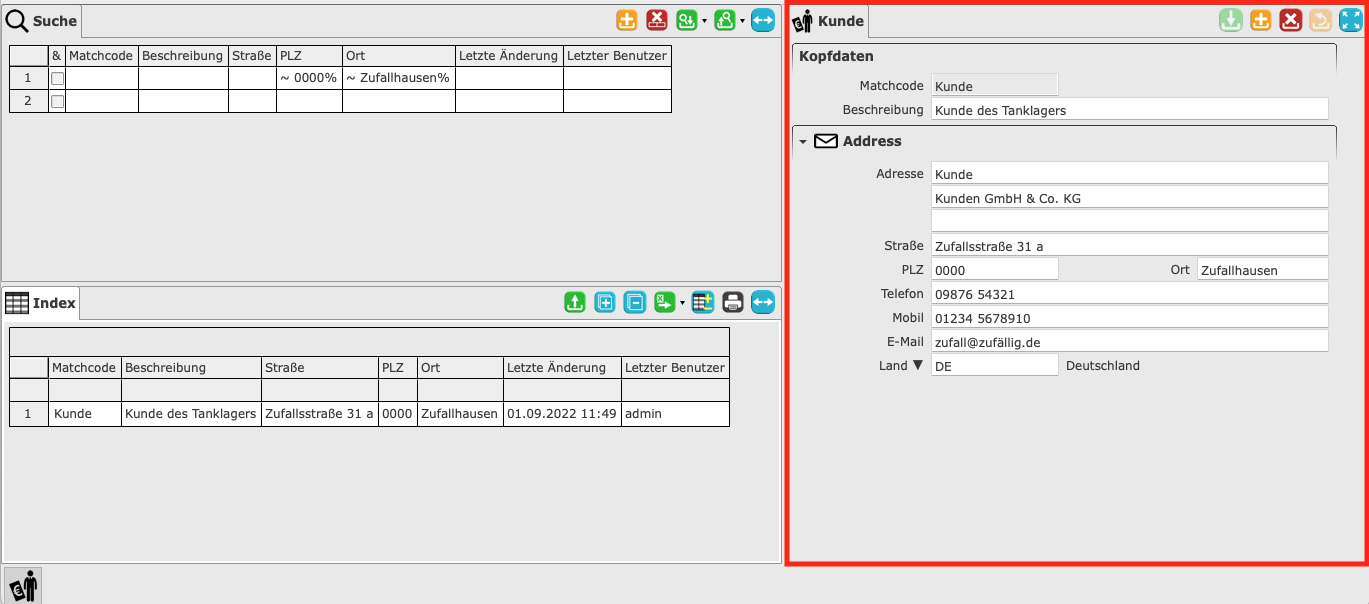 Im unteren Beispiel lässt sich ein Kunde erfassen. Der Detailbereich teilt sich hierbei in die Sektionen Kopfdaten und Addresse auf. Zur Erfassung eines Datensatzes müssen alle Pflichtfelder gefüllt werden. Obligatorische Felder sind orange, optionale Felder sind weiß hinterlegt.