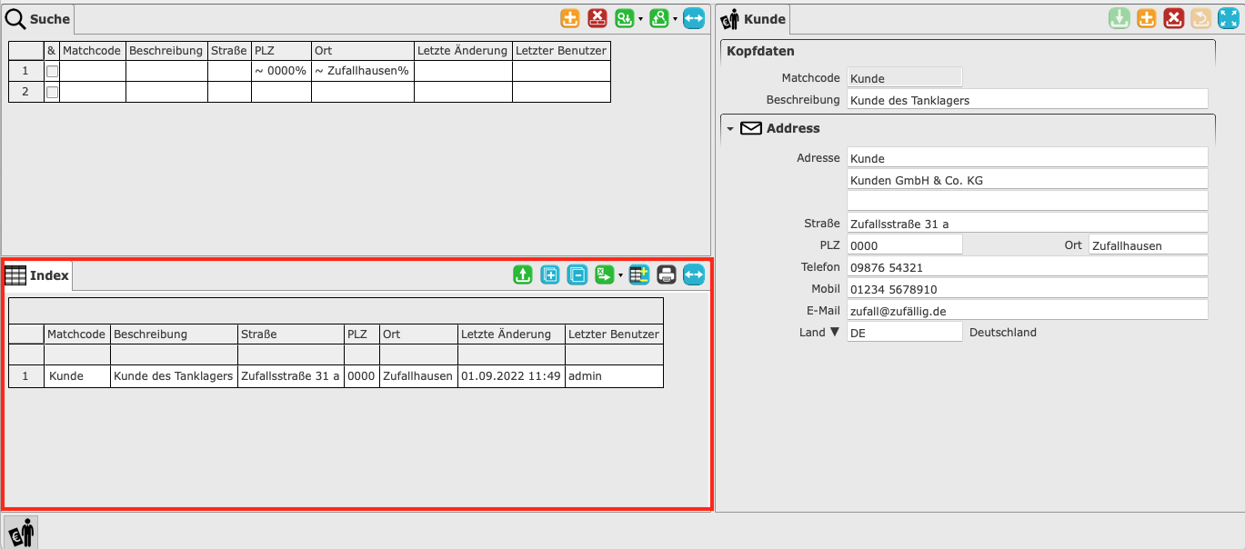 Der Index besteht aus einer Tabelle, die mit den Datensätzen der Maske gefüllt wird. Es können bis zu 1000 Datensätze ausgegeben werden. Die Ausgabe kann durch die Suche gefiltert und damit eingegrenzt werden. Die Spalten der Tabelle entsprechen den wichtigsten Feldern des Detailbereiches.