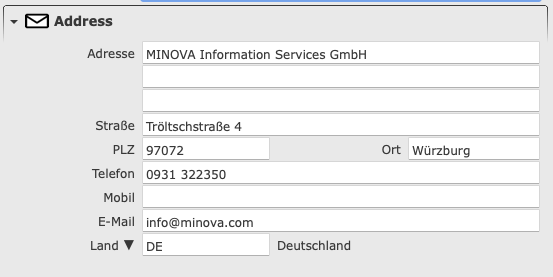 Als Sektion wird ein Abschnitt im Detailbereich bezeichnet. Diese enthalten Felder und Tabellen. Im folgenden werden standard Sektionen und Felder beschrieben.