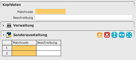 Die normale Sektion ist so aufgebaut wie die Kopfdaten und enthält verschiedene Felder, Auswahlboxen und Tabellen. Der einzige Unterschied liegt darin, dass die normale Sektion auf- und zuklappbar ist.